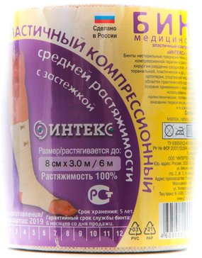 Эластичный компрессионнный бинт средней растяжимости 8 см х 3 м.В состав изделий входят хлопок, латекс, полиэфирные волокна. Большое содержание хлопка снижает вероятность развития кожных реакций и аллергии. Структура полотна компрессионных бинтов не затрудняет кожное дыхание, хлопок хорошо впитывает влагу и кожные выделения.